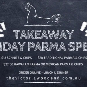 Monday Parma Takeaway Our chicken schnitzels are house crumbed, served with chips & garden salad Gluten free available additional 2 chicken schnitzel – $18 chicken parma – $20 hawaiian parma – $22.5 mexican parma – $22.5 ORDER TAKEAWAY NOW